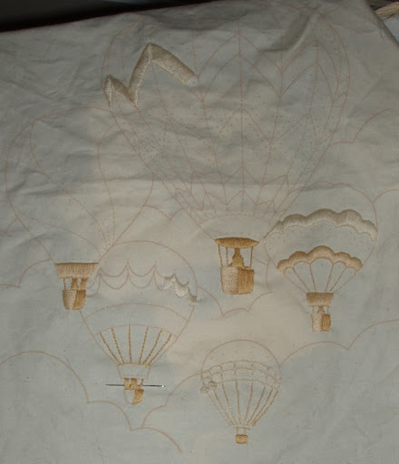 So, I’ve been working on a sculptured stitchery and candlewicking kit Majestic Balloons designed by Roger W. Reinardy, and available from Janlynn. It’s called sculptured stitchery because the design is backstitched over cotton batting to create a 3D effect around the balloons. The colonial knots creating the big dots and the straight stitches are the candlewicking part of the design, done in candlewicking thread. There’s also some satin and stem stitch in floss for additional decoration.