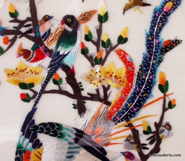 This is a beautiful piece of art. You are so lucky receiving this gift. My favorite bird is the one one with the longest tail. I assume it is supposed to be a peacock. Thank you so much for sharing.