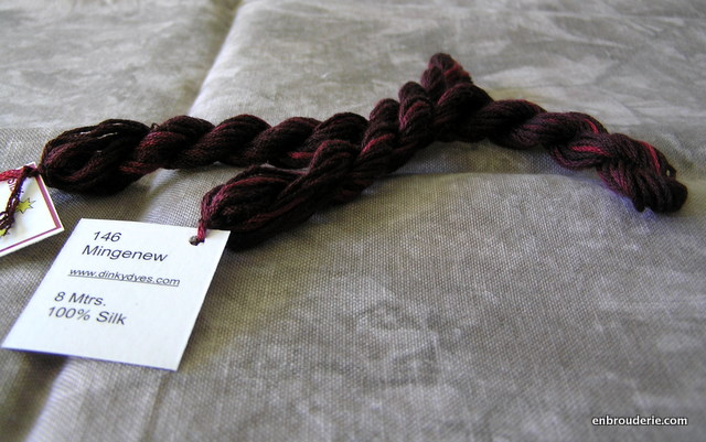 Now, I will have to be very careful with this project! I suspect it would be a  very bad idea to try washing dark red hand dyed threads. I’m not so sure about the hand-dyed linen, either. So I’d better do a very careful transfer of the pattern so it’s covered by the threads and doesn’t need washing out. The transfer must be very accurate. Maybe prick-and-pounce? And I’d also better be very careful to keep the project clean while working it.