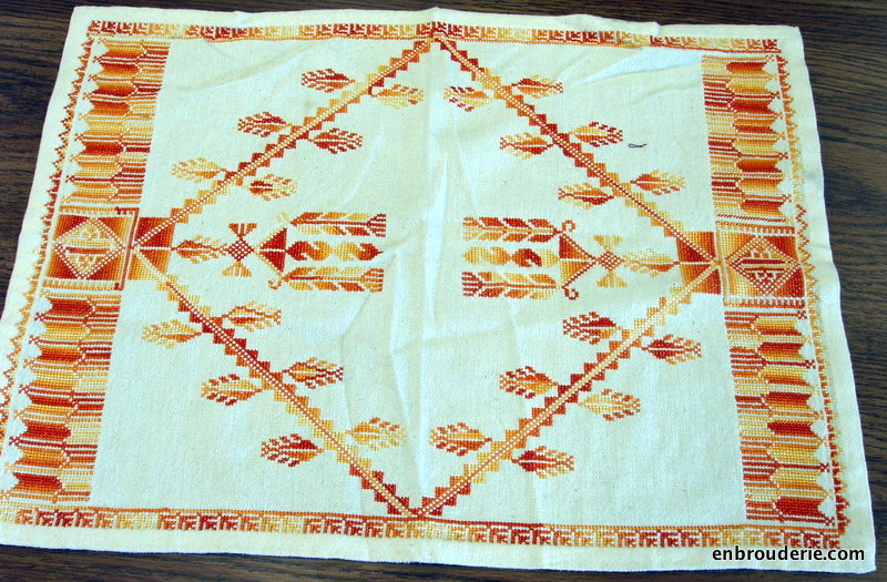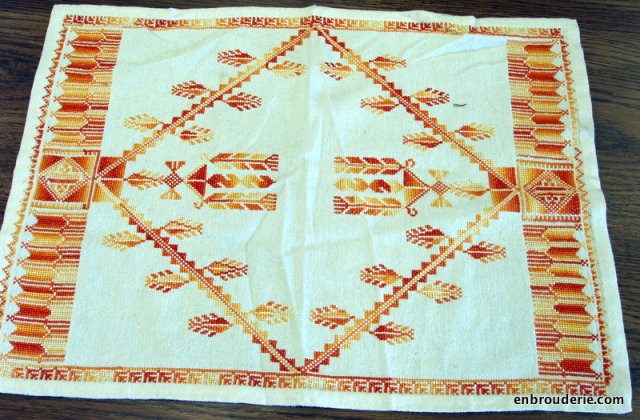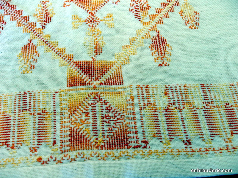 Here is another Palestinian cross stitch piece from Dr. Shirazi’s collection. I absolutely love the warm colors and the geometric motifs.