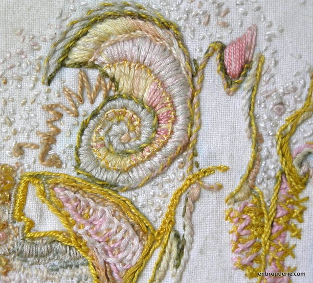 The zig zag straight stitches of the snail’s body are finished off with French knots for his eyes. His shell is made of stem stitch and satin stitch.