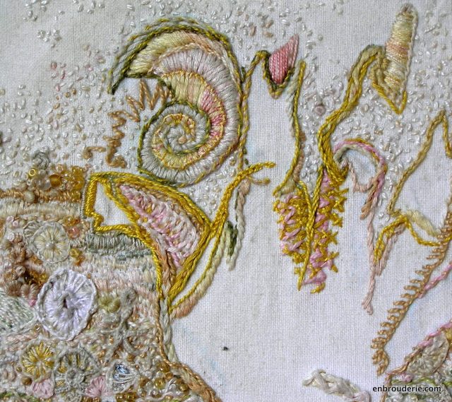 The beach surrounding the hand is made of all kinds of textured stitches. There are French knots, seed stitches, bouillons, and buttonhole wheels, as well as lines of back stitch and satin stitch. There are even a few beads for extra pretty.
