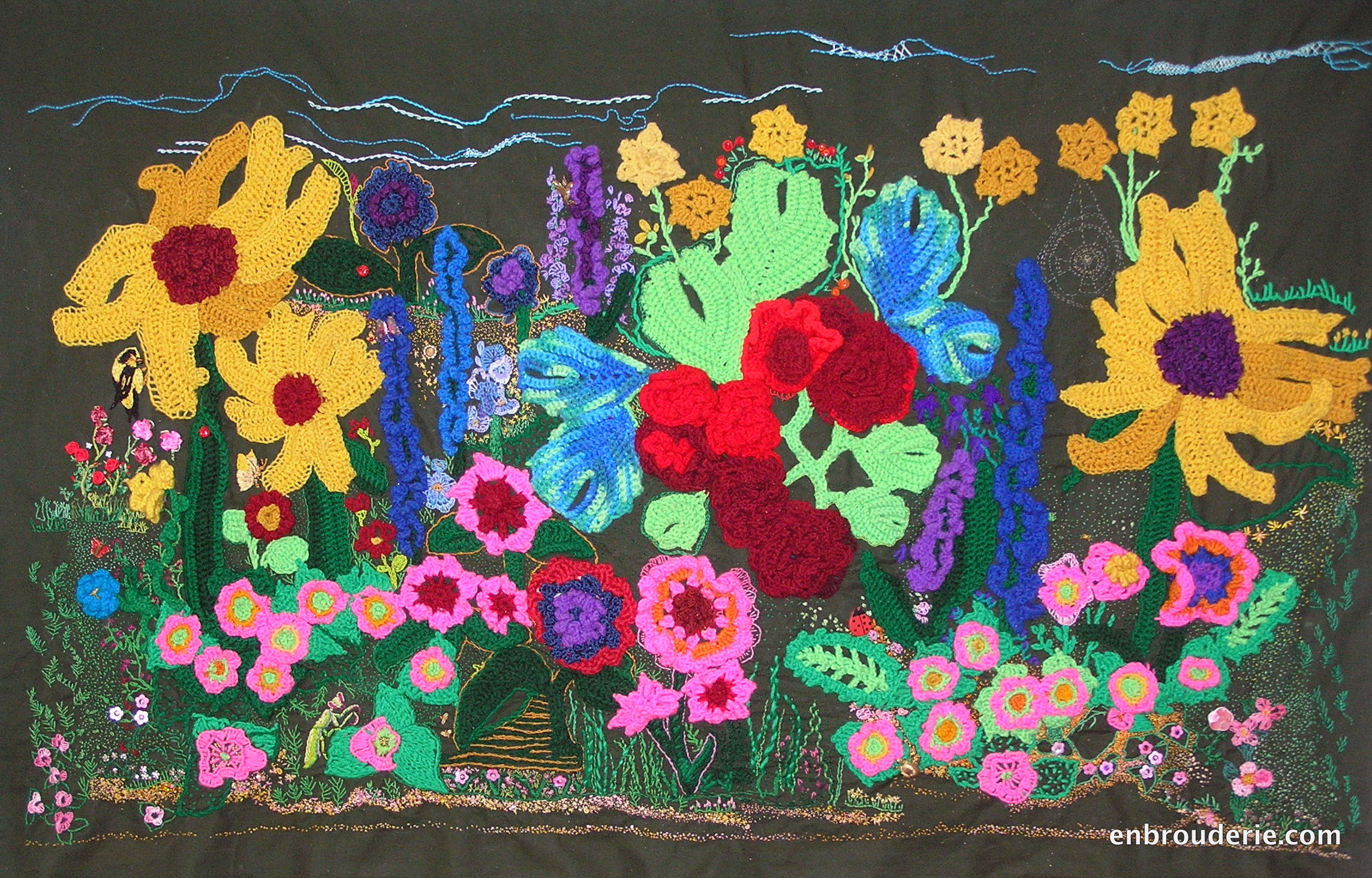 Finally, many flowers received a sparkle for their center with inexpensive pierced earrings. This technique would not work on a quilt (Ouch!) but this Big Green garden is destined for life as a curtain so pointy metal spikes are not an issue.