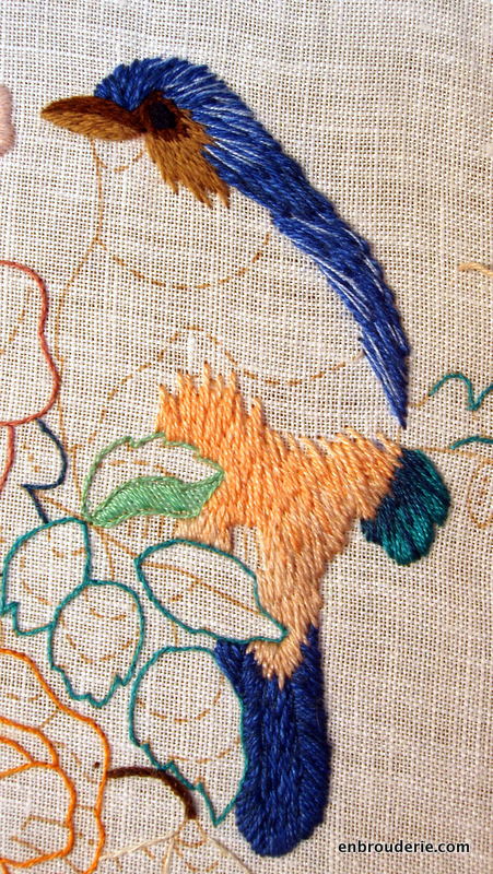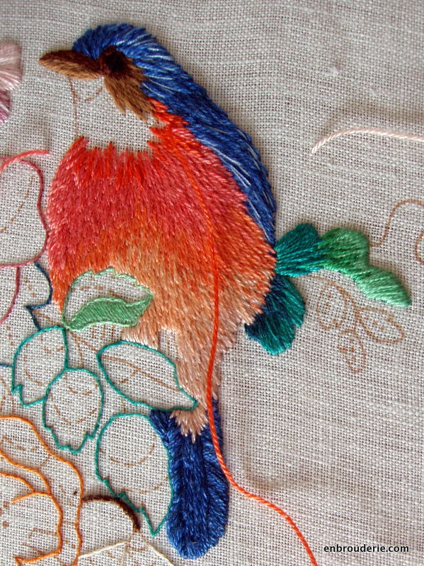 I too recently bought this book and I think it would be an invaluable resource for the novice needle painter. I think you are doing a lovely job of the blue bird. While most of what she covers is not necessarily news to me, I did learn one valuable thing. She points out that thread has a definite direction and that ensuring you thread your needle in the same direction every time will ensure more even results, especially when working satin stitch. For that one piece of information alone I consider the book money well spent.
