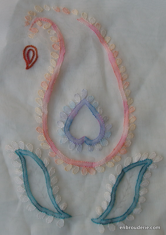Folks, I’m still alive, just terribly busy with my dissertation. Anyway! I have made some progress on Anita’s chikankari class and wanted to show you. Isn’t it pretty? I’m a little behind but I’m almost done with the outlining. I’m loving the colors of the variegated threads. Here’s a closeup.