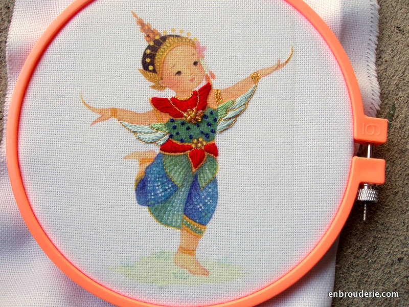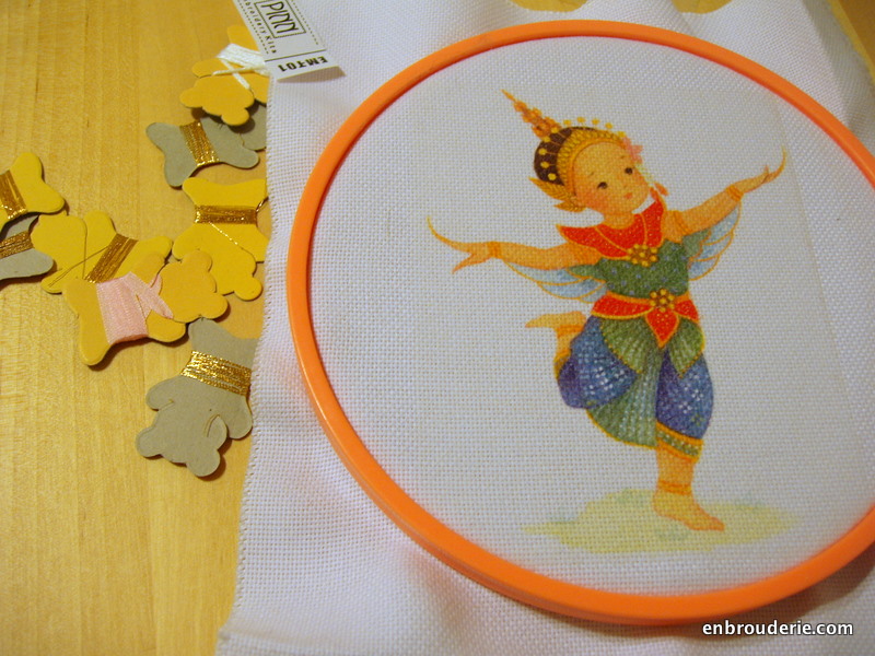 Y’all, I am officially defending my dissertation in November! HURRAY! Now that I’m not sick, I am making quick progress. In celebration, I am working this little bitty Thai dancer. It’s an embroidery kit from Pinn Stitch (they mostly have cross-stitch, but they both this kit and a second dancer). It comes with a frame (one of those rubber fake wood ones), gold thread, beads, and pink ribbon for embellishing the preprinted design, but I have decided to add more thread and embroider the whole thing. I have already started, and am having tons of fun.