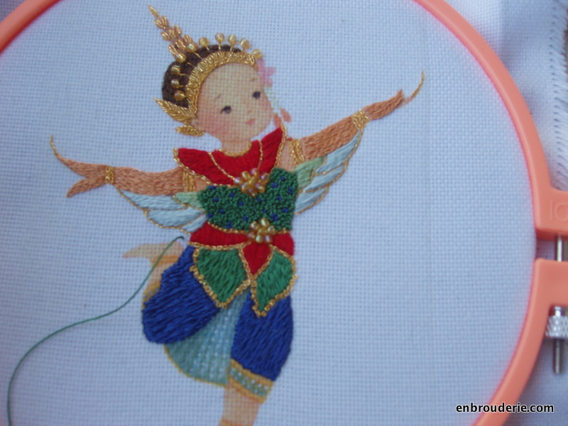 I have started on the arms in split stitch. I am thinking about how to work her face. I have never worked a face before, and I want to keep the expression.