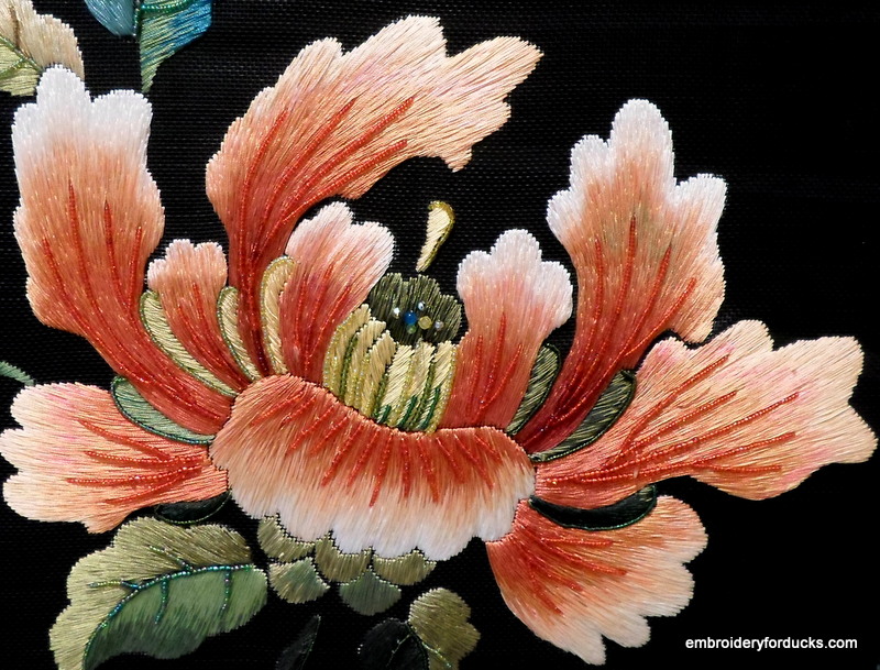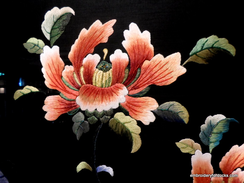 My brother visited Taiwan recently, and took these photos of a gorgeous embroidery hanging on the wall in Taipei 101, which was the world’s tallest skyscraper from 2004 to 2010. He estimates the embroidery was approximately 8 feet by 8 feet (2.44 meters by 2.44 meters). It shows an incredible amount of work! Look at how soft the shading is in the stitching below: