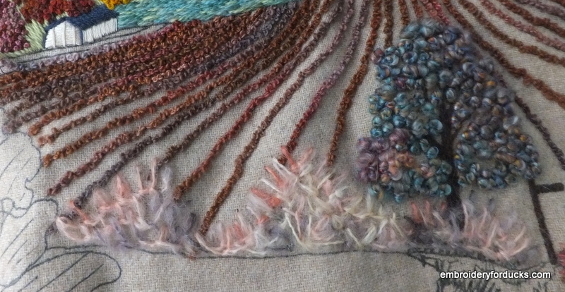 I am back at work on Hilltop Farm, from Rowandean! This very interesting curly yarn is couched down in furrows to create a plowed field, then bushes are worked in ridiculously fluffy variegated yarn. I still have to trim the fabric on the misty far-away hill, but the top half of the design is basically done!