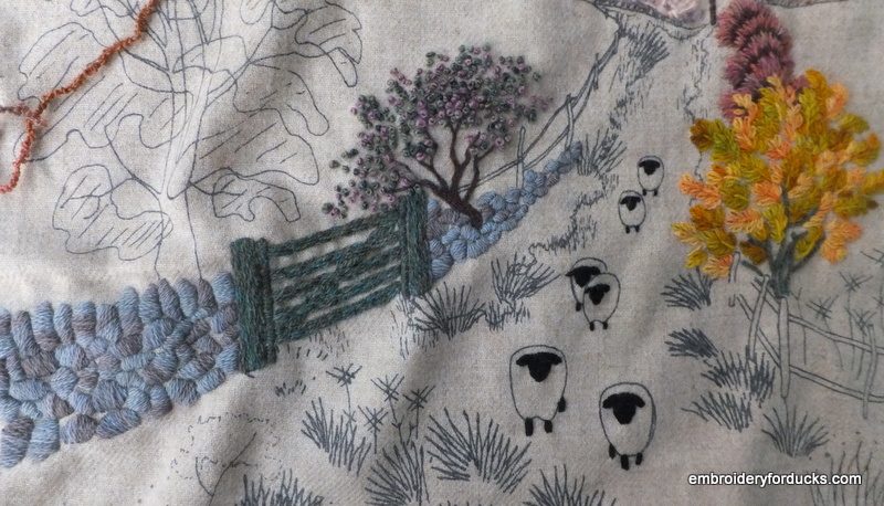 The bottom of the design is already in progress. I feel like the finish line is in sight! There is still a lot of grass, fences, and sheep left, but I’m feeling motivated!